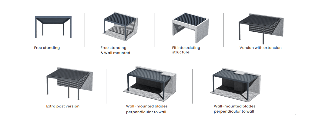 Bioclimatic Pergola system has its unique advantages so to be the favorite on the markets. Particularly, as to combine unique hollow blades with architectural aesthetics to completely block rain, it can ensure perfect waterproof effect after all louvers are fully closed, while it can withstand 180~220km/h winds. This system is the third generation of outdoor sunshade louvers based on all-aluminum technology.